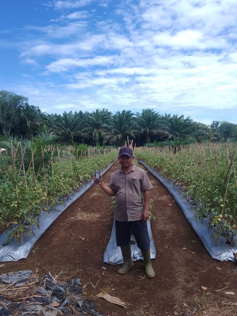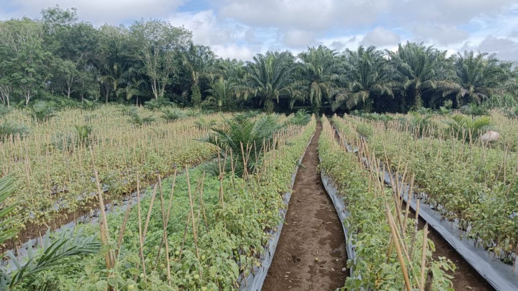 Hij begon met het verbouwen van tomaten tussen de palmbomen. “Omdat mijn palmoliebomen nog niet hoog zijn, groeien de tomatenplanten die ik heb geplant goed en krijgen ze voldoende zonlicht,” legt hij uit.