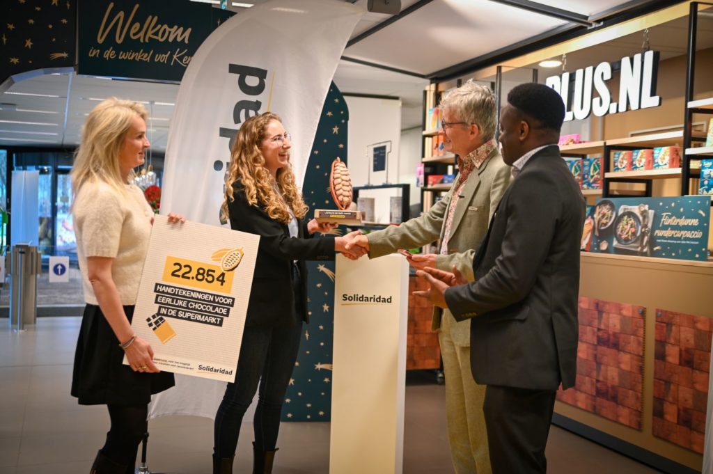 Campagneleider Charlotte van den Arend: “In totaal hebben meer dan 22.500 mensen onze petitie getekend: zij willen uitsluitend chocolade in het schap waarvoor de boeren ook brood op de plank krijgen.”