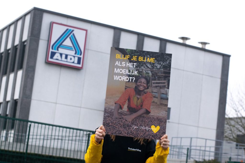 Solidaridad zet zich samen met andere maatschappelijke organisaties zoals Oxfam Novib, al jaren in voor betere prijzen voor cacaoboeren. Zo zijn we onderdeel van Dutch Initiative on Sustainable Cocoa (DISCO), het publiek-private platform voor betere leef- en werkomstandigheden voor cacaoboeren en hun gezinnen, dat wordt geleid door IDH. Supermarkten zijn hier ook onderdeel van, maar van serieuze inzet voor leefbare inkomens zagen we de eerste jaren nog maar weinig terug. Omdat praten niet hielp, is Solidaridad in september 2024 gestart met een consumentencampagne. Uit bijbehorend onderzoek bleek dat 93% van de chocolade in de supermarkt oneerlijk is – boeren kunnen er geen leefbaar inkomen aan verdienen. Daarop startte Solidaridad de petitie voor eerlijke chocolade in de supermarkt, en bezorgden ze op Valentijnsdag een kaartje namens de cacaoboeren bij de supermarkten met de veelzeggende tekst: “Blijf je bij me als het moeilijk wordt?”