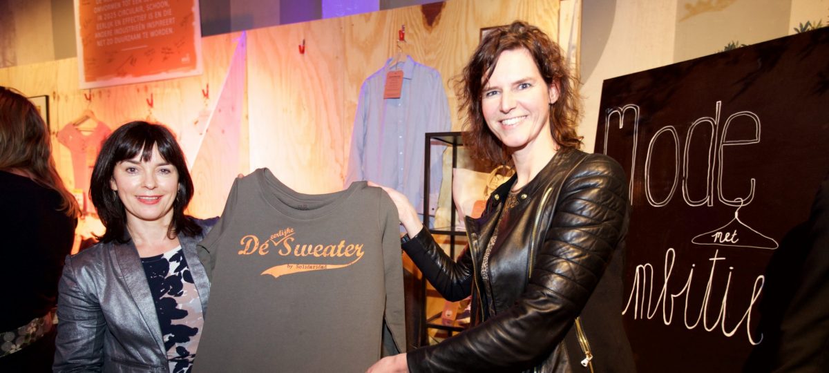 “Wat geweldig, je inzet voor verduurzaming van de modesector. We kennen allebei de immense problemen die spelen in de kledingproductie. En ik moet bekennen het zijn vaak verdomd hardnekkige problemen. Maar het kan anders. Deze eerlijke Sweater is daarvan het tastbare bewijs. Ik geef hem je graag als symbool voor hoe het kan: Kleding die met respect voor mens en milieu is gemaakt,” aldus Janet Mensink.
