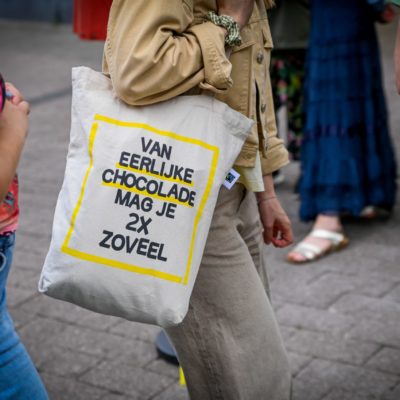 - Vraag merken waar de cacao in hun product vandaan komt en hoe duurzaam de productie is. Óók als ze een keurmerk hebben. Duurzaam gecertificeerde chocola is een stap in de goede richting, maar niet de oplossing voor alle problemen in de cacaosector.