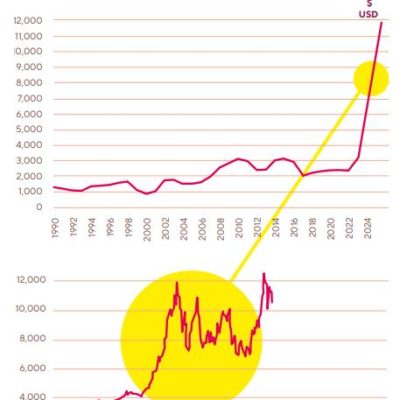 Afbeelding: de wereldmarktprijs van cacao over de afgelopen 35 jaar (USD).